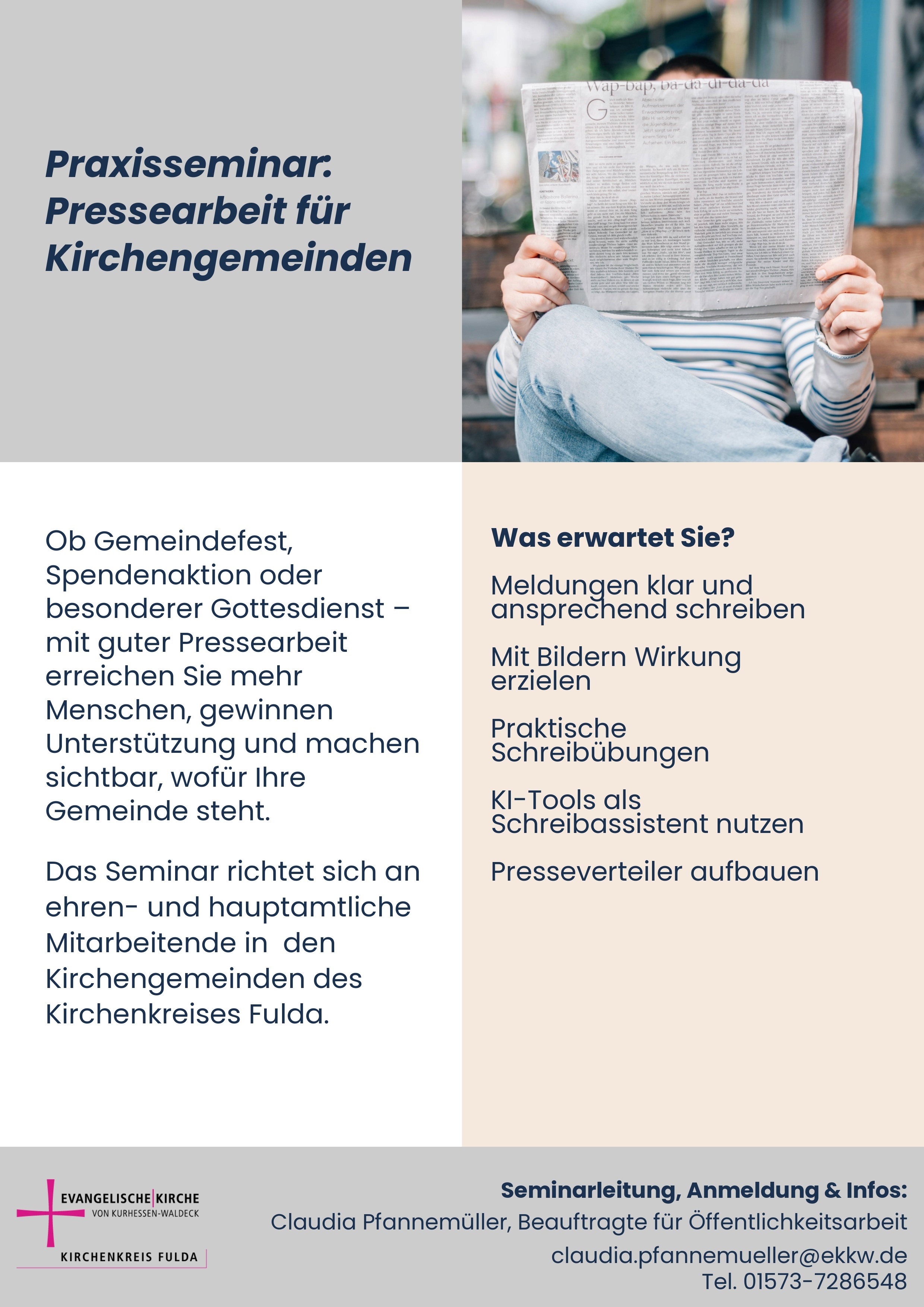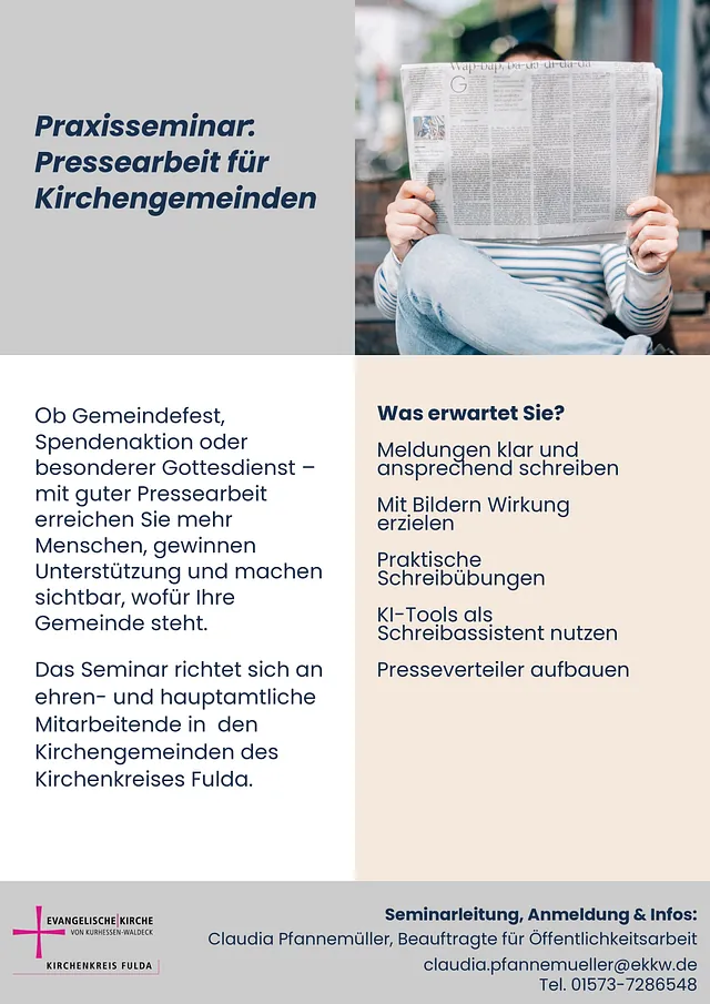 Öffentlichkeitsarbeit ist Dialog: Dialog zwischen Kirchenkreis, Kirchengemeinden, Einrichtungen und den Medien. An dieser Schnittstelle ist die Öffentlichkeitsarbeit tätig. Zu meinen Aufgaben als Beauftragte für Öffentlichkeitsarbeit des Kirchenkreises Fulda gehören die interne und externe Kommunikation mit all ihren Facetten, die Beantwortung von Presseanfragen, das Verfassen von Pressemitteilungen für den Kirchenkreis, die Pflege der Webseite des Kirchenkreises, die Veröffentlichung eines regelmäßigen Newsletters, die Betreuung der Social Media Kanäle und die Mitarbeit bei der Planungen von Großveranstaltungen wie dem z.B. dem Hessentag.