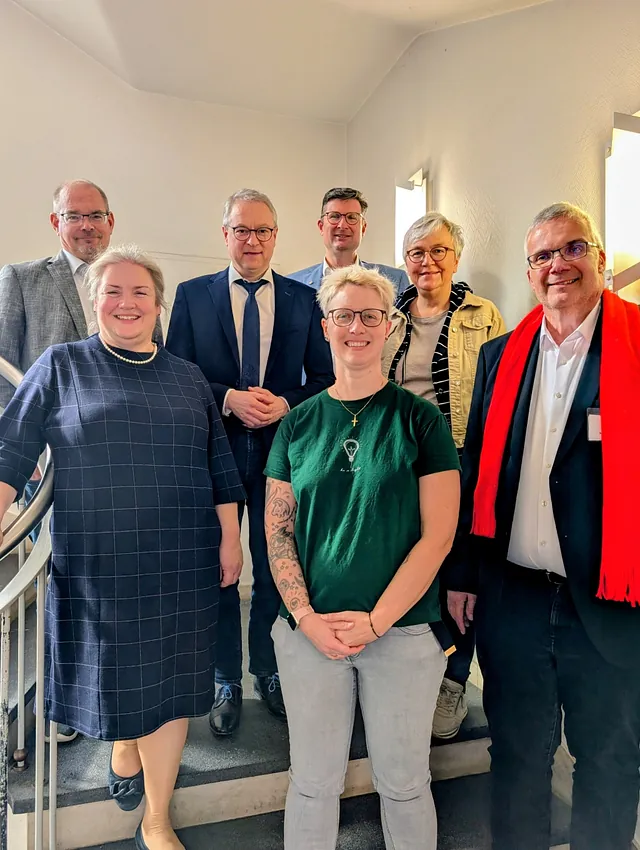 Zum Kirchenkreisvorstand gehören vlnr: Edda Steinmetz, Pfarrer Lars Peter Rilke, Dekan Dr. Thorsten Waap, der stellvertrende Dekan Marvin Lange, Simone Möhring, Hilde Hehr-Willhardt und der Vorsitzende der Synode, Andreas Maraun. Nicht im Bild: Theresia Vonderau-Fern.